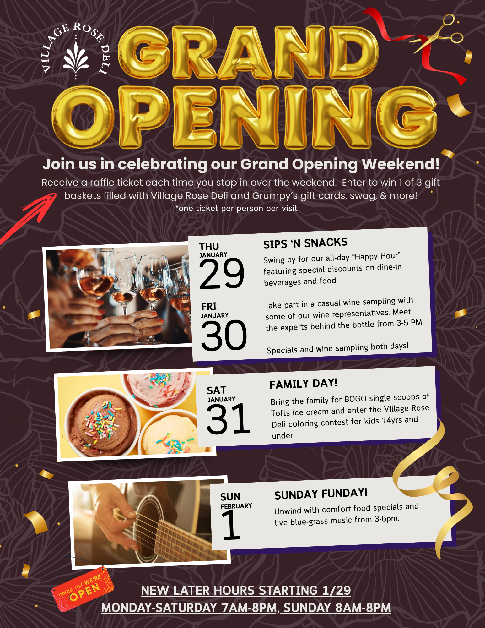 Receive a raffle ticket each time you stop in over the weekend and enter to win 1 of 3 gift baskets filled with Village Rose Deli and Grumpy’s gift cards, swag, & more!