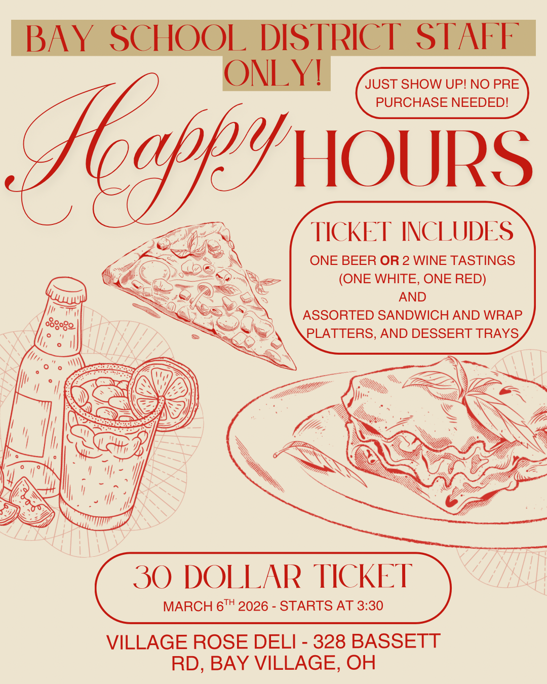 Join us anytime after 3:30pm on Friday, March 6th for a casual event. Tickets are $30 and include a beer or 2 wine tasting (white and red) along with assorted sandwiches, wraps, and desserts. Tickets can be purchased at the door but please RSVP below if you plan to come!