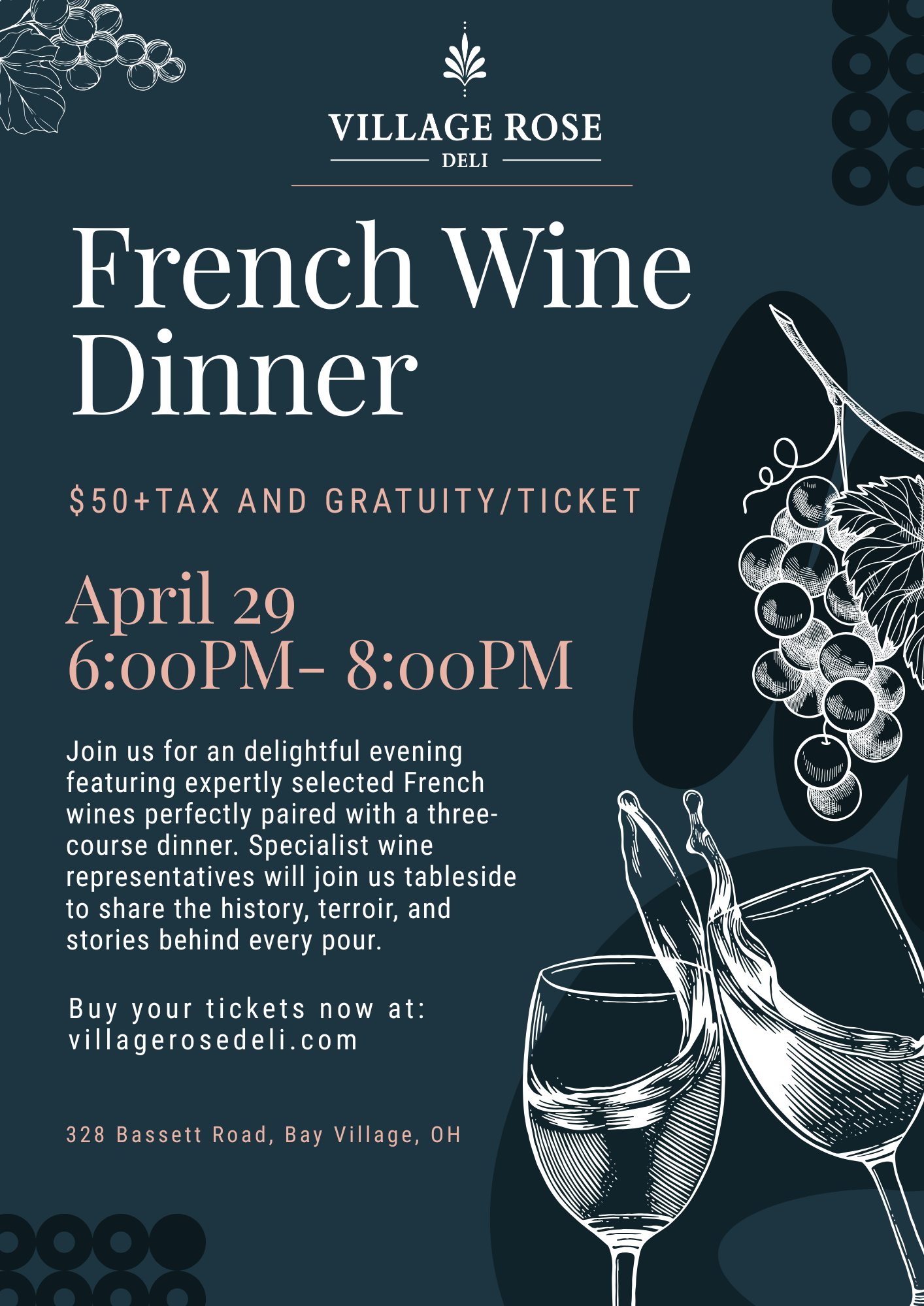 Join us for a French Wine Tasting Soirée on April 29th, from 6pm-8pm.